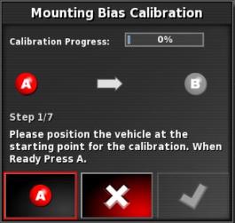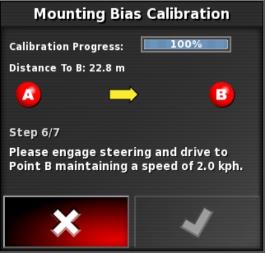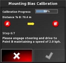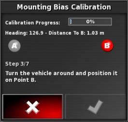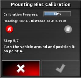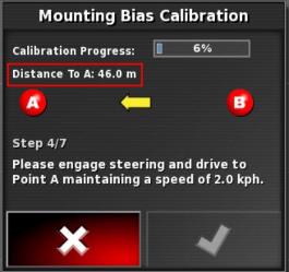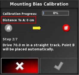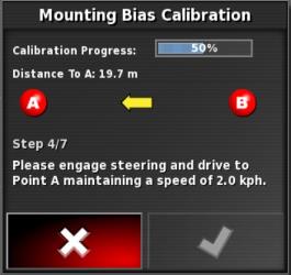 Hinweis: Zum Kalibrieren des Ausrichtungswinkels werden auf einer Strecke von 70 Metern (230 ft) die Wegpunkte „A“ und „B“ angelegt und das Fahrzeug mit 2 km/h (1,2 mph) auf der Weglinie gefahren. Am Ende der Bahn wendet der Fahrer das Fahrzeug und wiederholt den Vorgang. Das Fahrzeug muss die Wegpunkte „A“ und „B“ auf etwa 30 cm genau treffen, damit der nächste Kalibrierschritt eingeleitet werden kann.