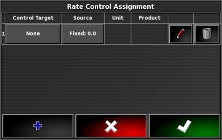 Jede Zeile in der Tabelle steht für eine variable oder feste Applikation eines Steuerziels auf dem Arbeitsgerät. Die Namen und die Anzahl der wählbaren Steuerziele hängen vom ISOBUS-Arbeitsgerät ab (weitere Informationen finden Sie in der Dokumentation zum ISOBUS-Arbeitsgerät).