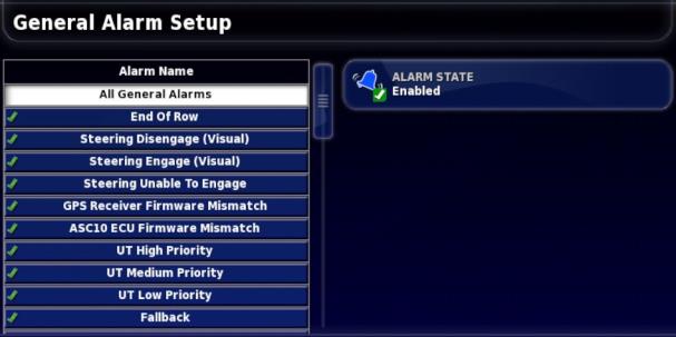 Wenn im System keine Arbeitsgeräte eingerichtet wurden, können nur allgemeine Alarme eingerichtet werden. Arbeitsgerätespezifische Alarme sind verfügbar, sobald ein Gerät definiert wurde. Weitere Informationen finden Sie in der Betriebsanleitung.