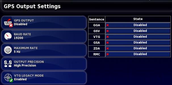 • Modus Legacy VTG: unterstützt die Ausgabe von VTG-Daten für die NMEA-Standards vor Version 4.00. Erzeugt VTG-Ketten kompatibel mit NMEA Version V3 und höher.