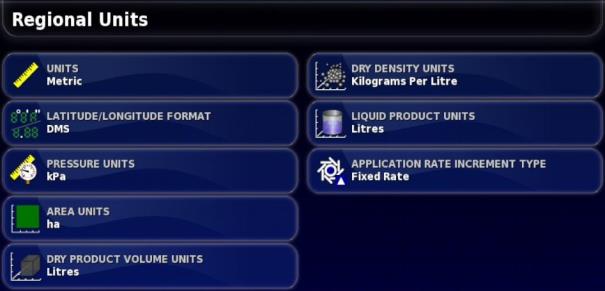 Mit den Optionen unter „Regionale Einheiten“ stellen Sie die Anzeige von Maßeinheiten (Metrisch oder Angloamerikanisch), Druckeinheiten, Fläche und Produkte, das Format der geografischen Breite und Länge und Inkrement für die Ausbringmenge ein.
