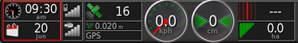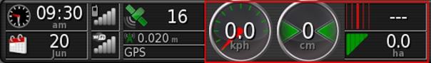 Die Felder „Spurführungsinformationen“ können so konfiguriert werden, dass vier von sechs möglichen Optionen angezeigt werden: Kursabweichung, Geschwindigkeit, Richtung, Schwade, Bearbeitete Fläche oder Verbleibende Fläche.