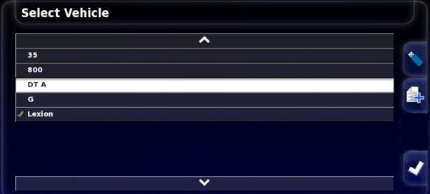 Wählt ein Fahrzeug aus einer zuvor definierten Liste mit Fahrzeugprofilen aus. Diese Liste ist bei der ersten Verwendung der Konsole leer.